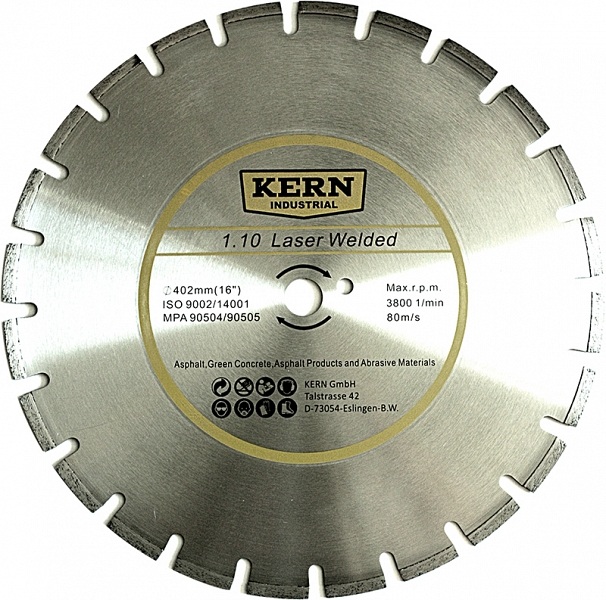 Алмазный диск Kern 1.10 Laser Welded U-Slots 402 мм (Керн 1.10 Лазер Велдед У-Слотс 402 мм) предназначен для мокрой алмазной резки свежего бетона, асфальта, абразивных материалов, битума и т.п. Используется с бензорезами, электрическими резчиками, камнерезными станками, настольными пилами, стенорезными машинами, швонарезчиками и другой алмазной техникой.