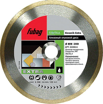 Диск отрезной алмазный Fubag Keramik Extra (Фубаг Керамик Экстра) предназначен для сухой и мокрой резки всех видов плитки, твердого искусственного камня, прессованного камня, гранитных и мраморных плит, стекла. Используется на болгарках (ушм), плиткорезах электрических, камнерезных станках.