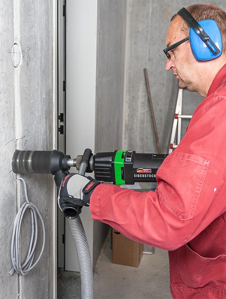 Дрель для сухого алмазного сверления с микроударом Eibenstock ESD 1801 (Айбеншток ЕСД 1801) предназначена для сухого бурения отверстий Ø до 90 мм в особо твердых материалах, например, таких, как: сильно спрессованный известняк, железобетон и другие абразивные материалы; с высокой рабочей скоростью; для изготовления стеновых и кровельных проемов для сантехнических, отопительных и вентиляционных установок; для электромонтажных работ, заглубления розеток, например, таких, как: выключатели и розетки.