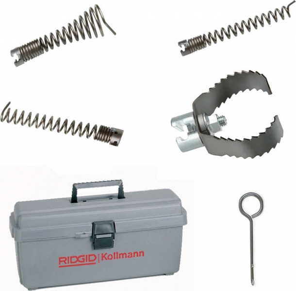 Комплект насадок для прочистки канализации Ridgid A-61 (Риджид А-61) предназначен для обследования и разрушения пробок, для взятия образца засора, чтобы определить нужную насадку (T-101); для разрушения остатков засора (T-102 – последующая насадка, вводимая в трубу после насадки с прямой головкой); для поиска в трубе сломанной или потерянной прочистной спирали (T-125); для чистки труб от любых налипаний на стенках (T-150-1).