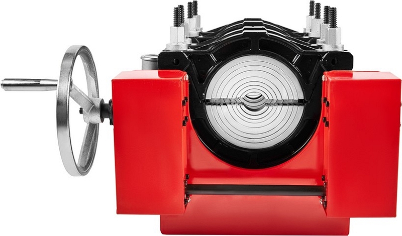 - Центратор с 4-мя откидными зажимами, редуктором и манометром имеет большой запас прочности за счет качественного сплава и ребер жесткости, что позволяет сваривать полимерные трубы с любым показателем SDR