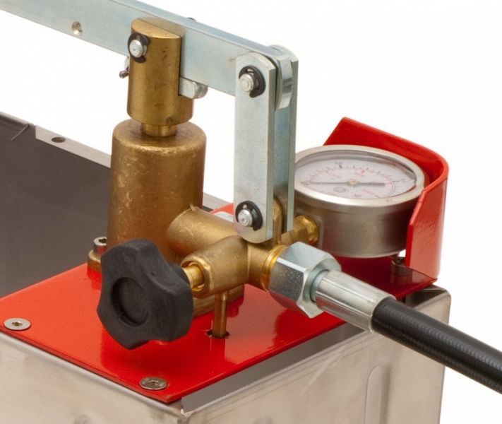 Насос опрессовочный ручной MGF Compact-60 (МГФ Компакт-60) – профессиональный испытательный ручной опрессовщик с горизонтальным резервуаром из нержавеющей стали и манометром для опрессовки, проверки и испытания водопроводных, санитарно-гидравлических систем, в соответствии с действующими техническими регламентами, до 60 бар, а также для небольшой перекачки, наполнения и создания давления в закрытых системах.