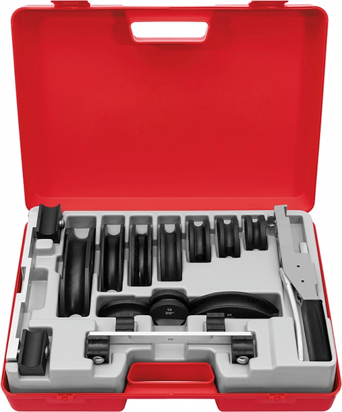 Трубогиб арбалетный ручной Roller Polo Set Allround 32 10-12-14-15-16-17-18-20-22-25/26-32 мм (Роллер Поло Сет Оллраунд 32 10-12-14-15-16-17-18-20-22-25/26-32 мм) – практичный, очень удобный, сверхлегкий трубогиб для работы одной рукой для легкой, простой и точной гибки мягких медных труб Ø 10 – 22 мм, 3/8" – 7/8", толщиной стенки до 1 мм; медных труб с мягкой оболочкой Ø 10 – 18 мм, 3/8" – 5/8", толщиной стенки до 1 мм; труб из углеродистой стали с мягким покрытием систем пресс-фитинга Ø 12 – 18 мм, толщиной стенки до 1,2 мм; труб из мягкой прецизионной стали Ø 10 – 18 мм, толщиной стенки до 1 мм; многослойных композитных труб Ø 14 – 32 мм; на угол до 90° при изготовлении колен и отводов на стройплощадках и в местах с ограниченным доступом.