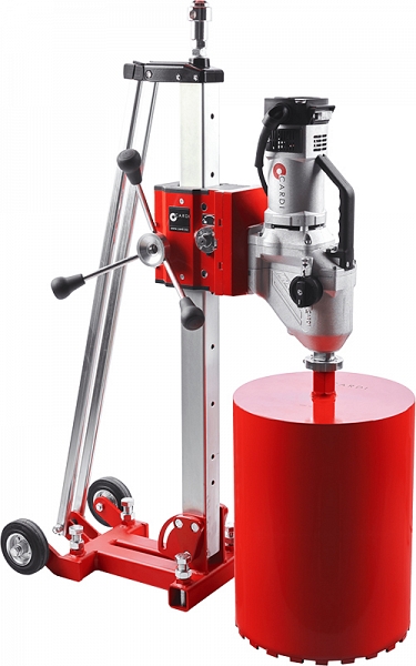 Установка алмазного бурения Cardi 501 (Карди 501) предназначена для сверления отверстий Ø 25 – 500 мм в бетоне, железобетоне, асфальте, кирпиче под углом 0° – 75° с обязательной подачей воды.