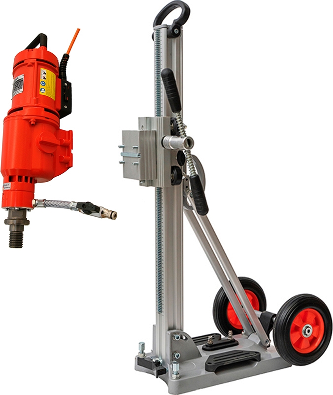 Установка алмазного сверления Dr. Schulze Drillkomplekt 200 Standart Plus (Доктор Шульце Дриллкомплект 200 Стандарт Плюс) с возможностью вакуумного и анкерного крепления предназначена для бурения отверстий в бетоне, армированном железобетоне, кирпиче, природном камне и других строительных материалах Ø 40 – 250 мм, под углом до 45°, с подачей воды, при проведении строительных работ, прокладке коммуникаций (вентиляция, водоснабжение, электрические сети) и других работах.